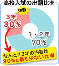 なぜ総復習が大事かというと…高校入試で出される問題の7割が中1・中2で習った内容だから。(中3で習う勉強は3割程ということに…)つまり!今まで習った範囲をどれだけ完璧にするかが、運命の分かれ道ってこと。