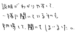 本人が解けなかった問題に一緒に取り組んでくれて、わかりやすく説明してくれたので良かったです。家庭の事情にも話を聞いていたため、こちらも安心してお願いできました。
