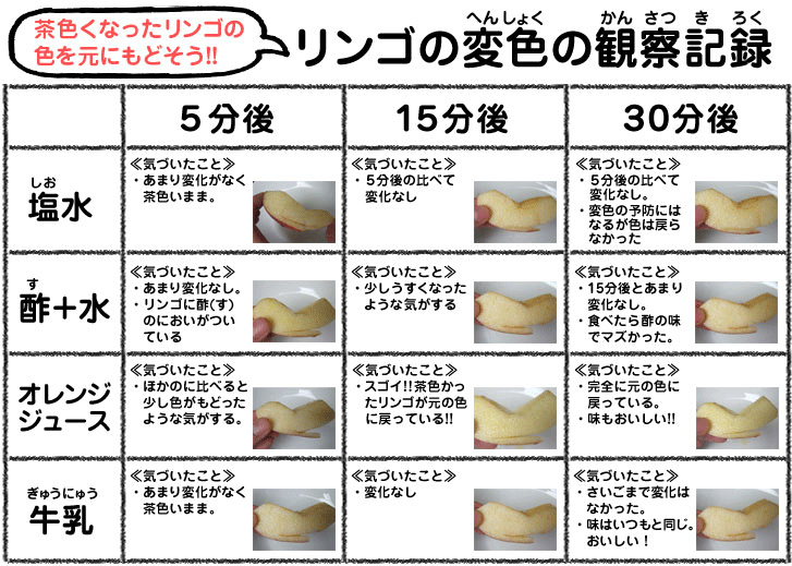 液体 につけてからの時間をキッチンタイマーではかり、時間になったらリンゴを液体 から取り出して色の変化 を観察 してみよう。