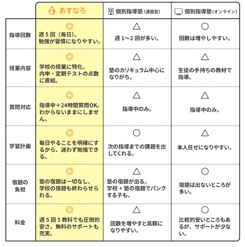 あすなろでは、学校ごとに作成したオリジナルテキストを使った指導法とお手持ちの教材を使った指導法、ご希望に合わせてピッタリなものが選べます。