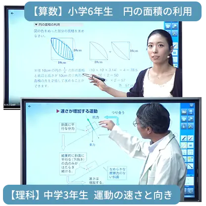 映像授業では、図・アニメーション・実験映像を使って≪見てわかる≫≪動きで理解できる≫ように工夫されています。特に理科の現象・数学の図形・社会の地理などは映像の方が圧倒的に頭に入りやすいです。 -