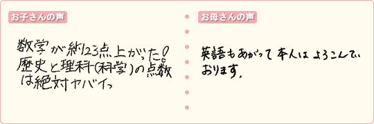 Aちゃん Aちゃん 中学1年 お子さんの声 数学が約23点上がった!歴史と理科(科学)の点数は絶対ヤバイっ 保護者の方の声 英語もあがって本人はよろこんでおります。 Kくん Iくん 学年別で見る 就学前オンライン小学1年中学3年小学6年小学5年小学4年中学2年中学1年高校3年高校1年高校2年小学2年小学3年中学1年生中学2年生中学3年生小学4年生小学5年生