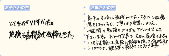 息子の生活に無理がないようにご配慮頂きながらも、丁寧な授業に加え、一週間の勉強のやり方をアドバイスして下さいます。おかげ様で先日の英検3級の1次試験は点数に余裕を持って合格することができ、親子共々感謝しております。