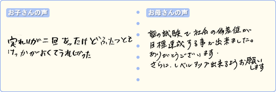 塾の試験で社会の偏差値が目標達成する事が出来ました。ありがとうございます。さらに、レベルアップ出来るようお願いします。