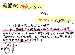 英語が14点くらいから40点ぐらいに上がった。いつもありがとうございます。少しずつ勉強の時間も長くなりがんばってます。分からないとこは分かりやすく、時にはスピードが速く分からないことがあるけど、分からないとこは何回も分かりやすく教えてくれます!